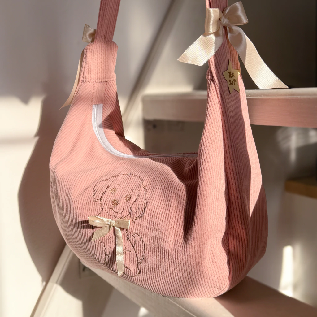 Bolso de corderoy con cierre. Cuenta con correa regulable, forro y bolsillo interno. Cómoda, liviana y resistente.