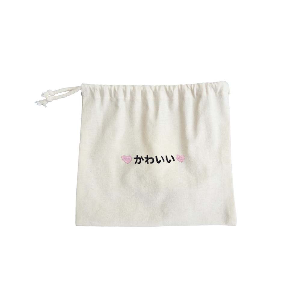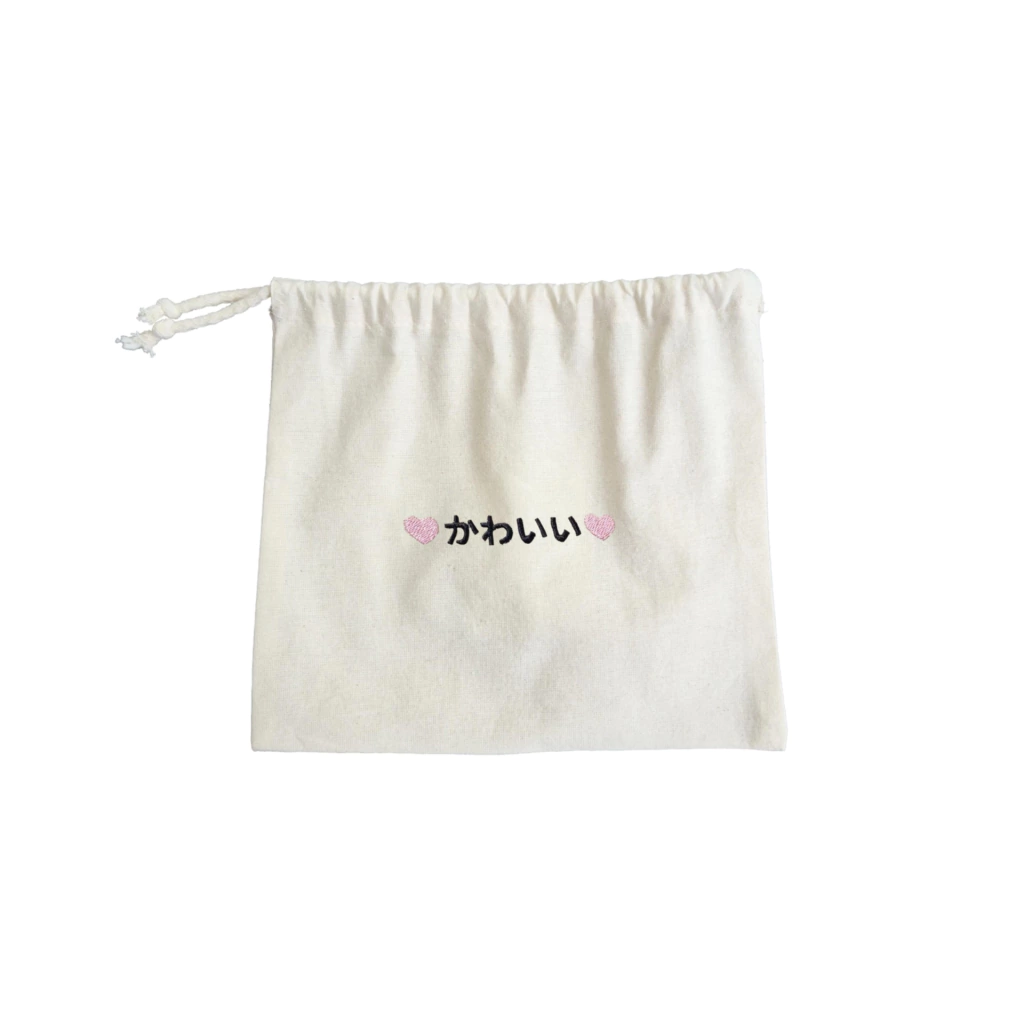 Bolsita de gabardina con cordón ajustable; cosida por Mamá Hanabi, con diseño bordado creado por nosotras y llevado a cabo a máquina (también por nosotras) + terminaciones hechas con nuestras manitos. Todo con mucho amor :)