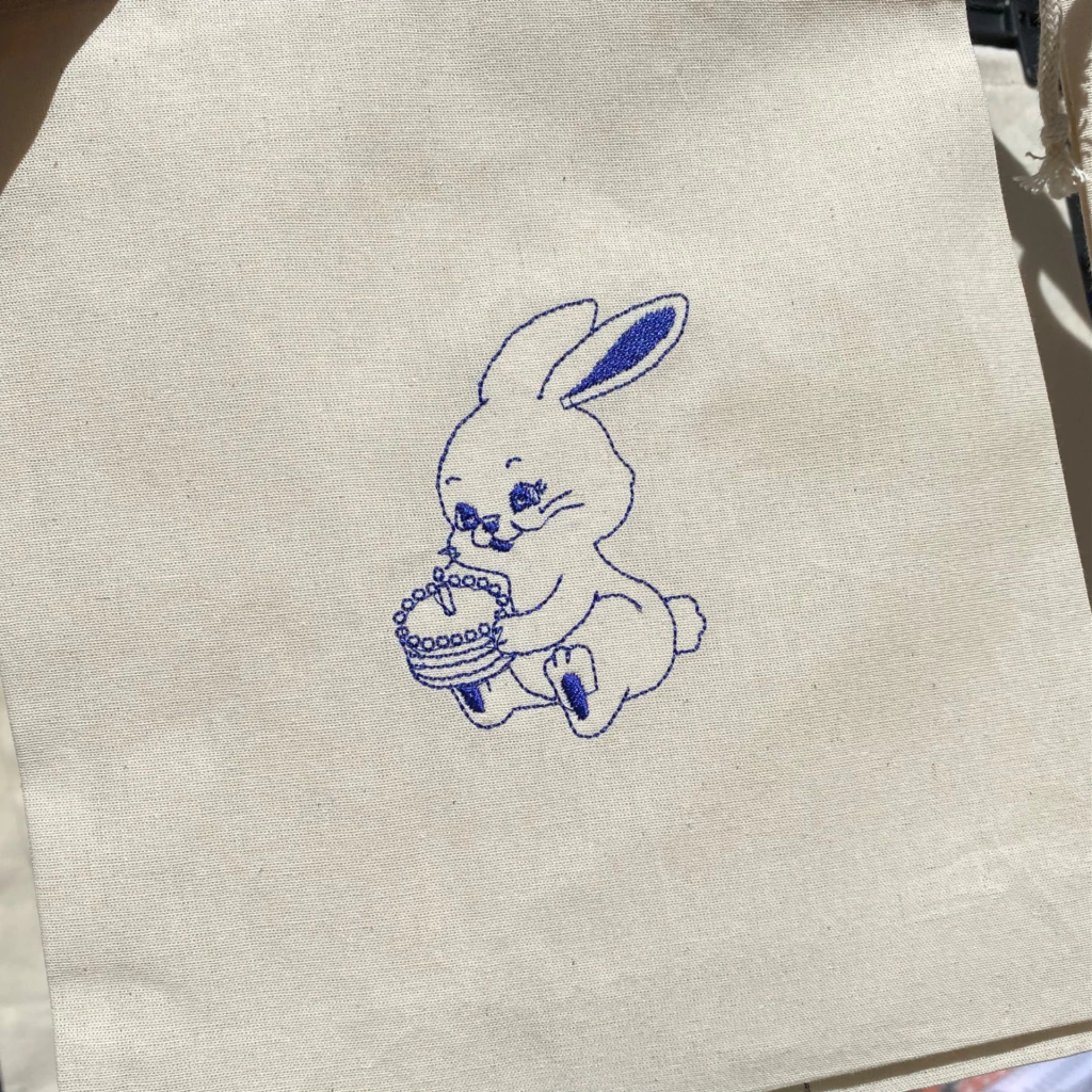 Bolsita de gabardina con cordón ajustable; cosida por Mamá Hanabi, con diseño bordado creado por nosotras y llevado a cabo a máquina (también por nosotras) + terminaciones hechas con nuestras manitos. Todo con mucho amor :)