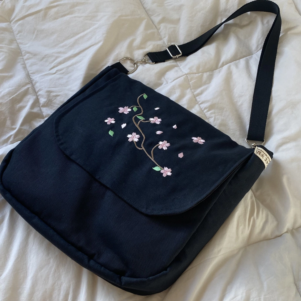 Bolso de gabardina, forrado, con bolsillo interno. Correa regulable de cinta mochilera. Cómodo, liviano y resistente: podés cargar libros, cuadernillos A4, laptops de hasta 15,6" y más.