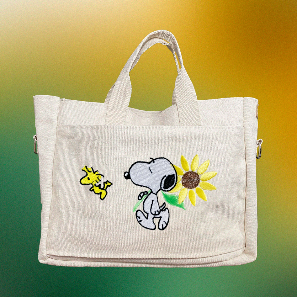 Cartera de lona con cierre. Cuenta con manijas fijas y correa regulable de cinta mochilera, forro y bolsillos interno y externo. Cómoda, liviana y resistente.